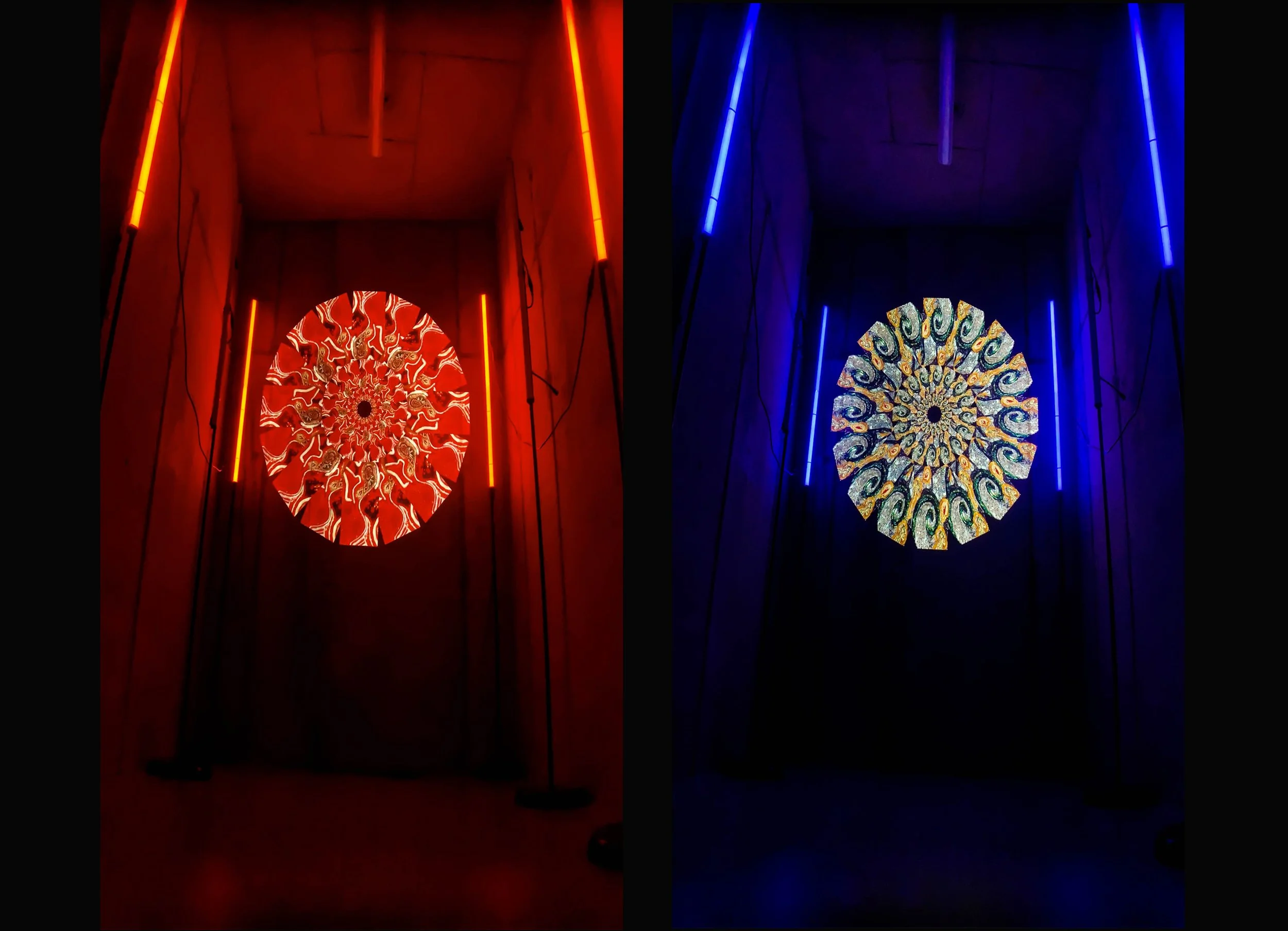 This Audio-visual piece is an experimental and dynamic fusion of traditional hand-crafted textile art by Kay and audio-visual digital mastery by Mortimore, where we see traditional embroidery techniques transformed through the lens of modern technology. Hand embroidered sequin crystal and bead embellished artworks have been documented through digitalized HD filmmaking and re-constructed through cutting edge digital techniques. These include; video mapping, live visual control, intelligent and a sensor reactive projection software. By merging their disciplines this immersive audio reactive experience features a digital projection design which is divided into 128 positional rings which intersect 127 velocities. This produces numerous combinations of light of varying wavelengths.